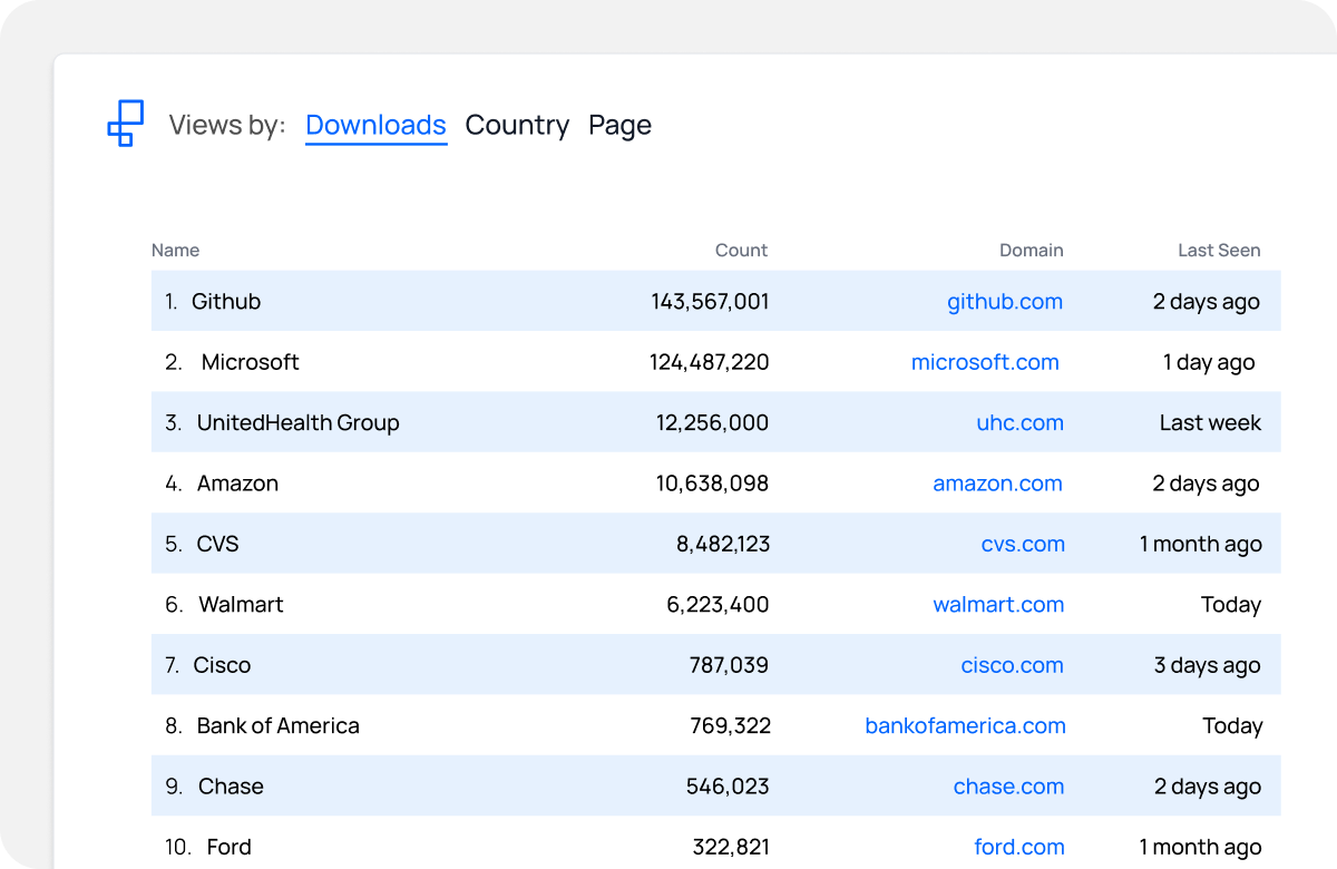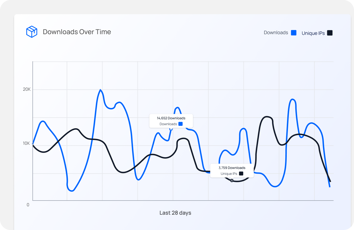 Track downloads of artifacts, packages, containers, docs, and binaries, anywhere on the internet