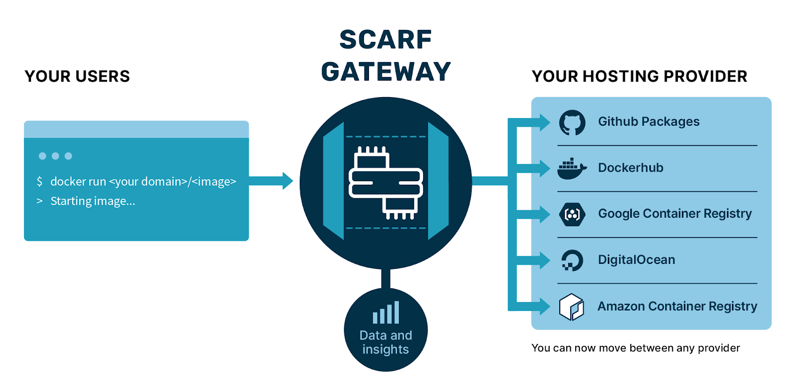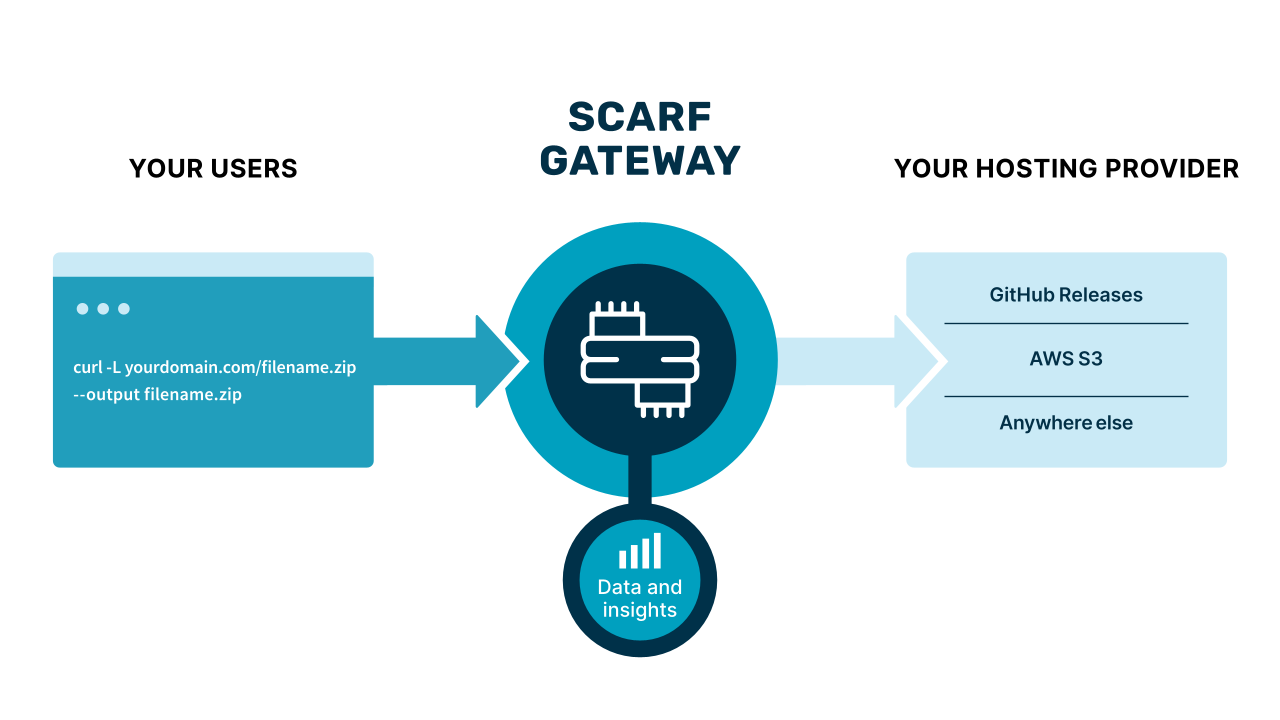 You can change the hosting provider of your packages, containers, and files without impacting the end user with Scarf.Scarf Gateway (available under the Apache 2 license at https://github.com/scarf-sh/gateway ) and our managed Scarf service are designed to provide you with an easy way to change out the back-end container registry, package location, or file hosting platform for your open source software. Scarf Gateway does this by creating a custom domain redirect to the channels distributing your software. If you find a provider not meeting your needs, simply update the endpoint, and all your users will continue using the same commands and destinations they used previously with no noticeable change.