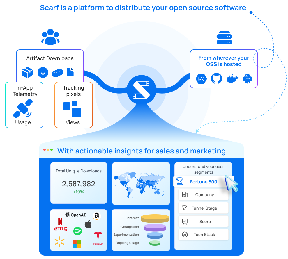 Scarf Packages are part of the service that sits in front of your existing software, acting as a single access point to all of your artifacts, regardless of where they are actually hosted. Scarf Packages decouple your distribution from your hosting provider to give you in-depth download analytics. scarf.gateway.scarf.sh