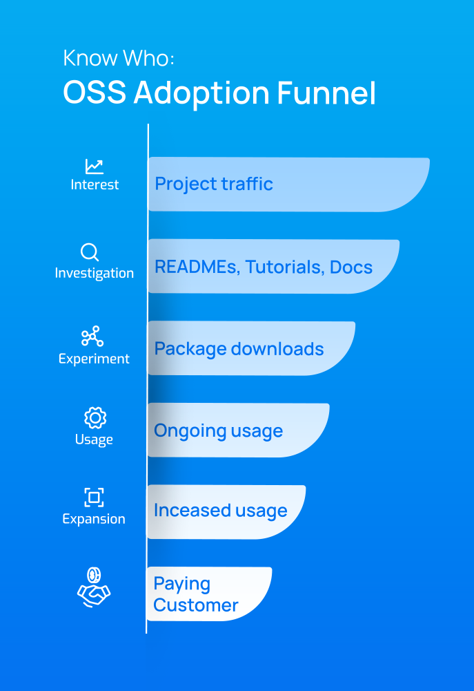 To accurately interpret metrics, they must be viewed within the context of an open source adoption funnel, which tracks user stages from discovering your project to deploying it in production and beyond. Scarf defines these stages as Interest, Investigation, Experiment, Ongoing Usage, and Paying Customer. Contextualizing metrics in these stages helps optimize activities, track usage trends, identify ideal customer profiles, and highlight opportunities and risks, such as early indicators of churn or documentation needing updates.