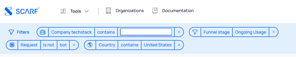 Starting today, July 11th, 2023, Scarf Basic and Premium users will be able to filter and cross filter by all of these categories. Get rid of bot traffic results, see which companies are in which geographical areas, and at which funnel stage are interacting with your open-source project.