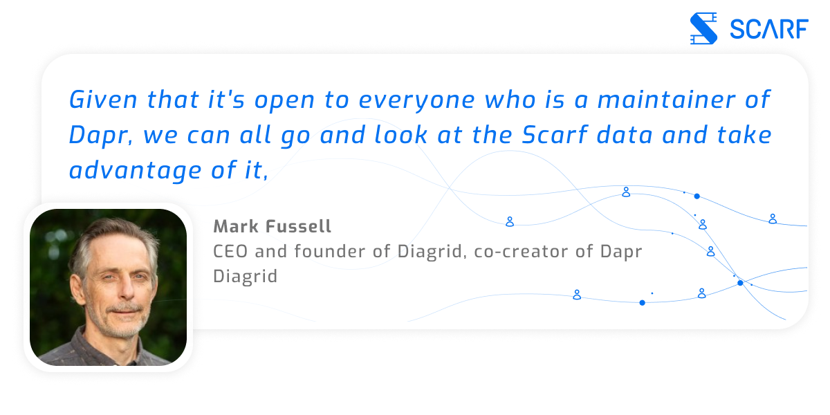 The Diagrid founders, as maintainers of Dapr in the CNCF, tested Scarf and brought the results to the Steering and Technical Committee (STC). Because of the high quality of the data provided, the privacy guarantees of the platform, and the fact that Scarf is an approved partner of the CNCF, the STC agreed to add Scarf to the Dapr project.