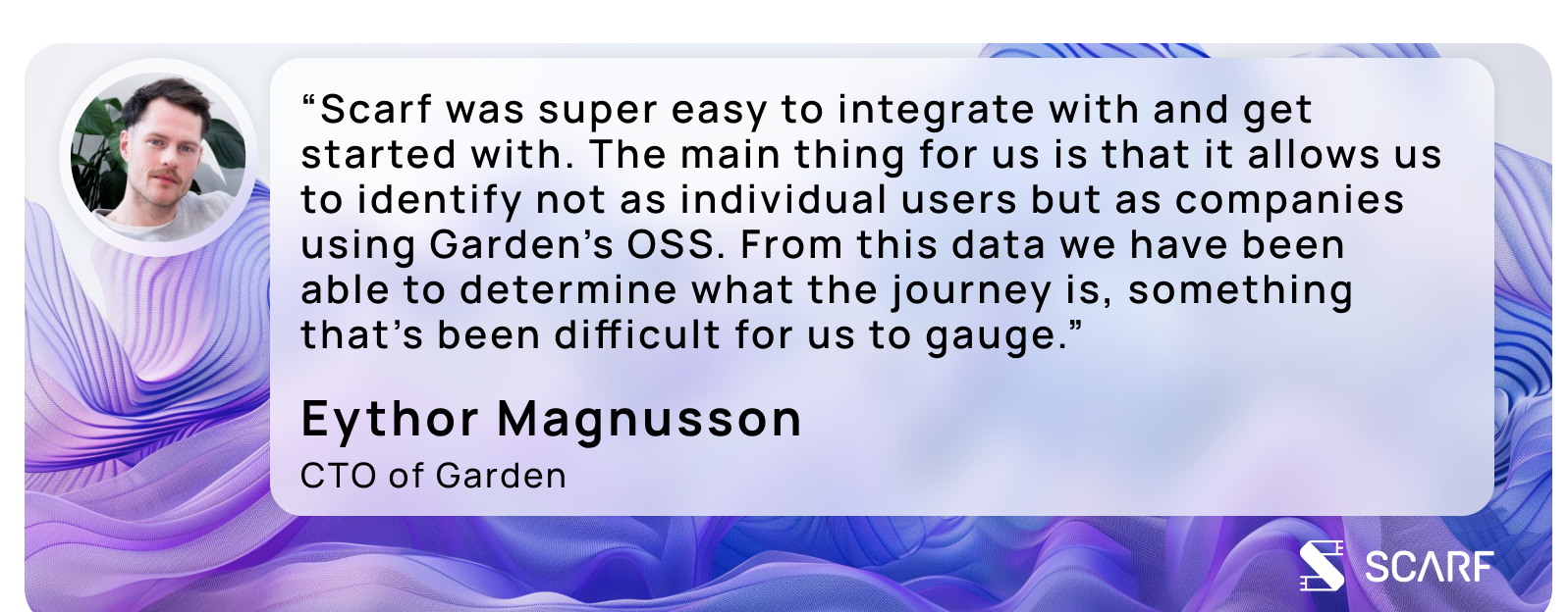 “Scarf was super easy to integrate with and get started with. The main thing for us is that it allows us to identify not as individual users but as companies using Garden’s OSS,” Eythor said. “From this data we have been able to determine what the journey is, something that’s been difficult for us to gauge”