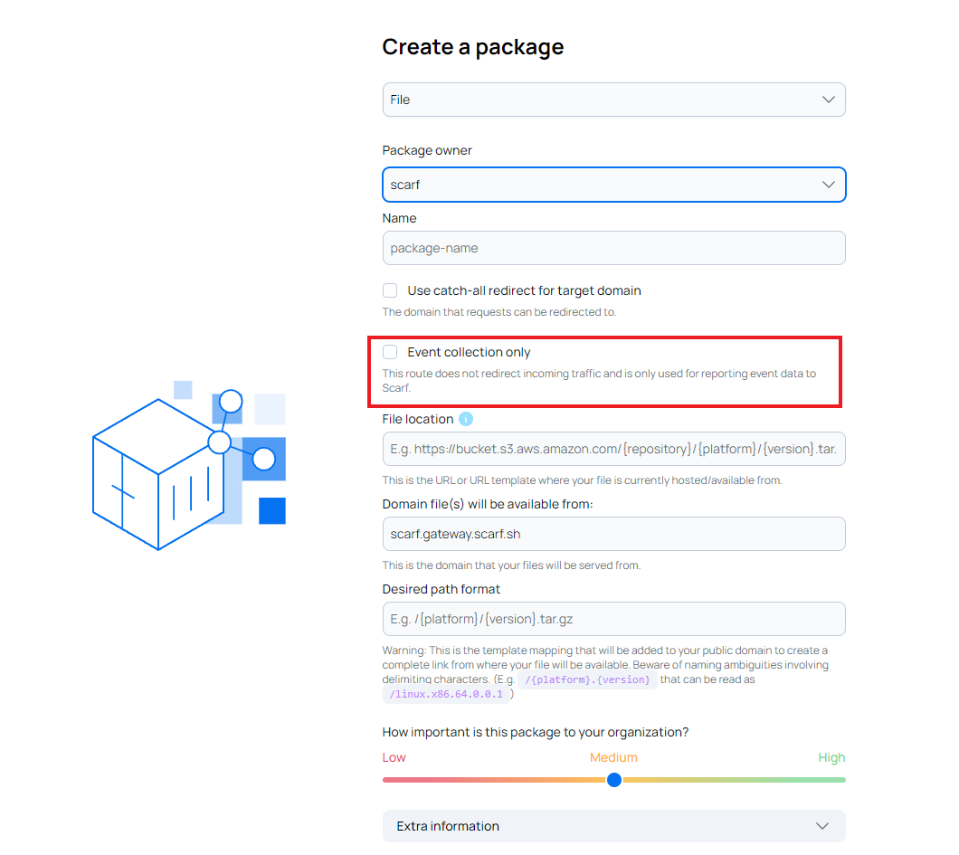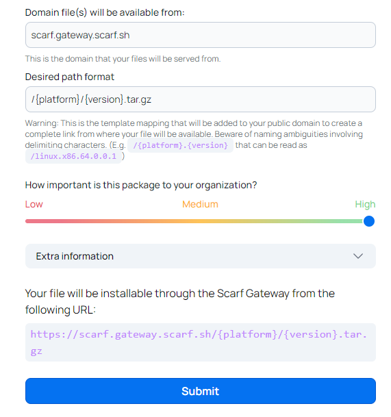 Choose the domain where your files should be available. You may choose to use your own domain to serve files. You may also choose to use <username>.gateway.scarf.sh, provided by default by Scarf.
