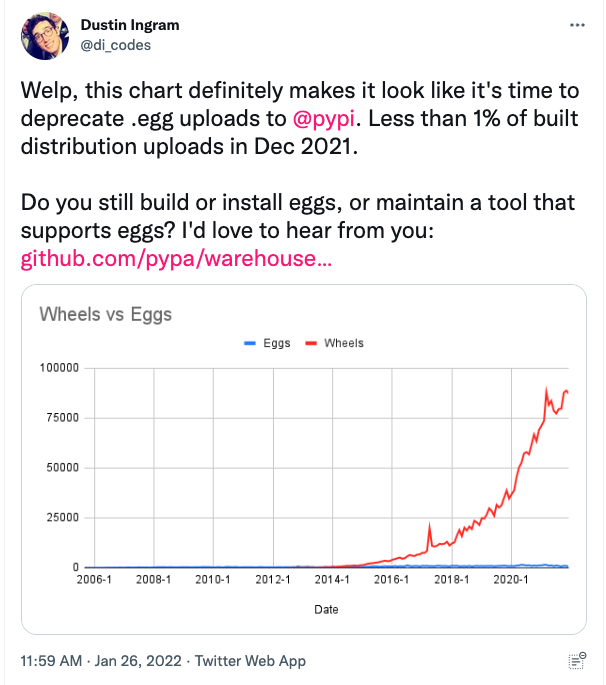 Currently, we’re going through one of those moments when it comes to Python Eggs. A recent tweet from Dustin Ingram showed that eggs accounted for less than 1% of built distribution uploads in December 2021.