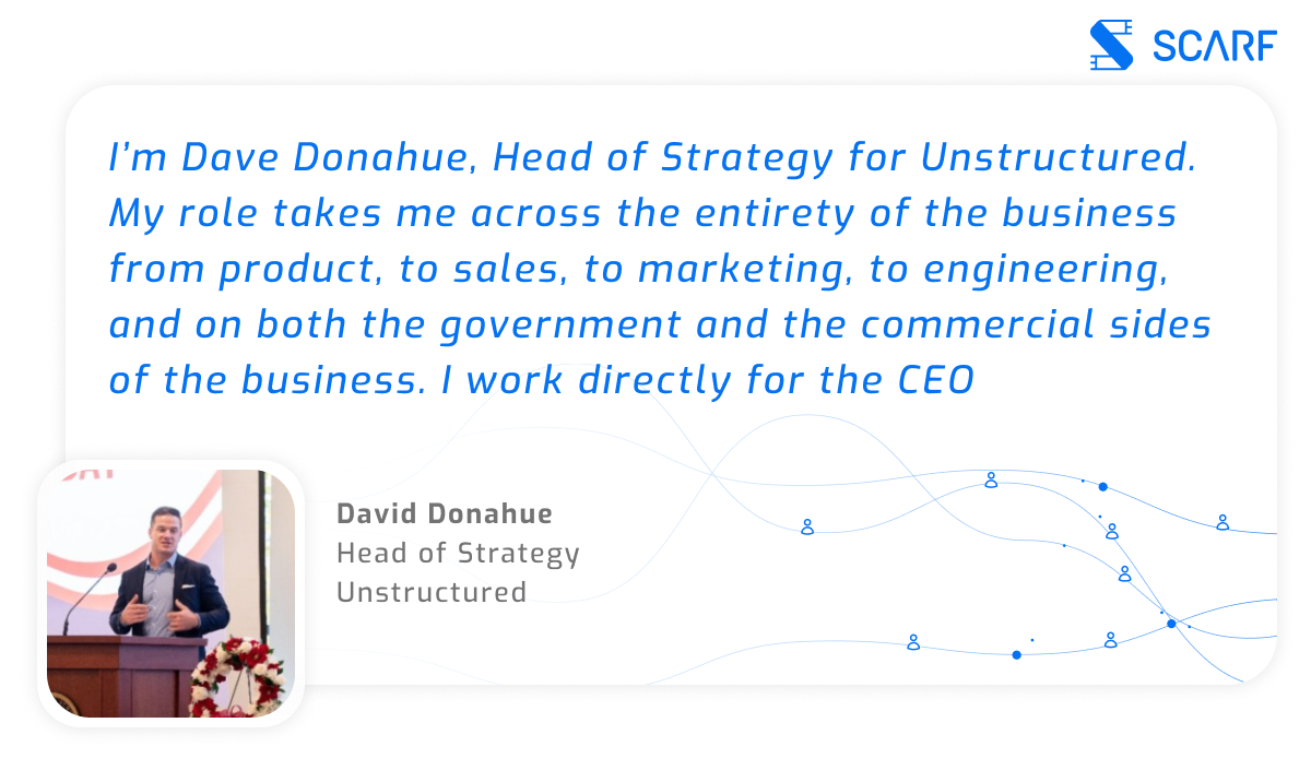 “I’m Dave Donahue, Head of Strategy for Unstructured. My role takes me across the entirety of the business from product, to sales, to marketing, to engineering, and on both the government and the commercial sides of the business. I work directly for the CEO.”