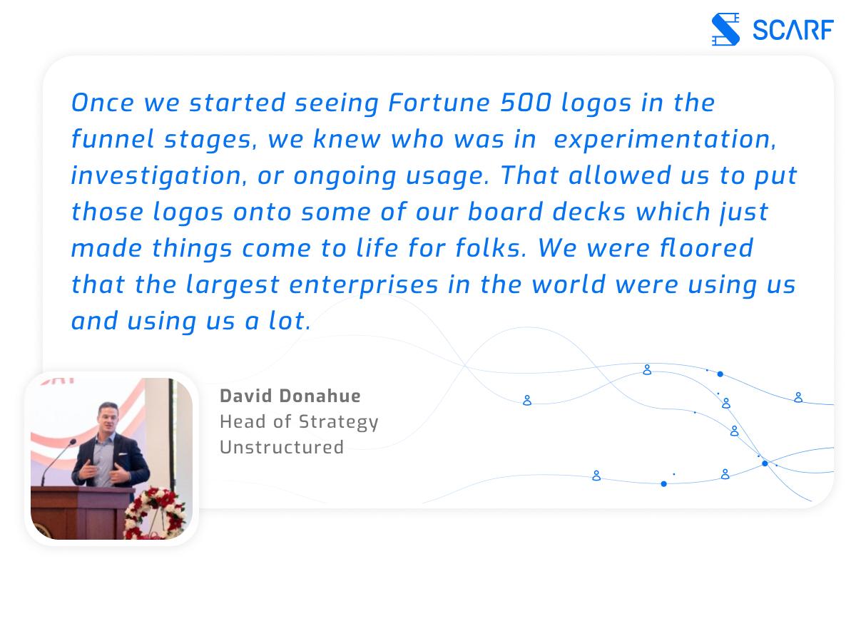 “Once we started seeing Fortune 500 logos in the funnel stages, we knew who was in experimentation, investigation, or ongoing usage. That allowed us to put those logos onto some of our board decks which just made things come to life for folks. We were floored that the largest enterprises in the world were using us and using us a lot.”