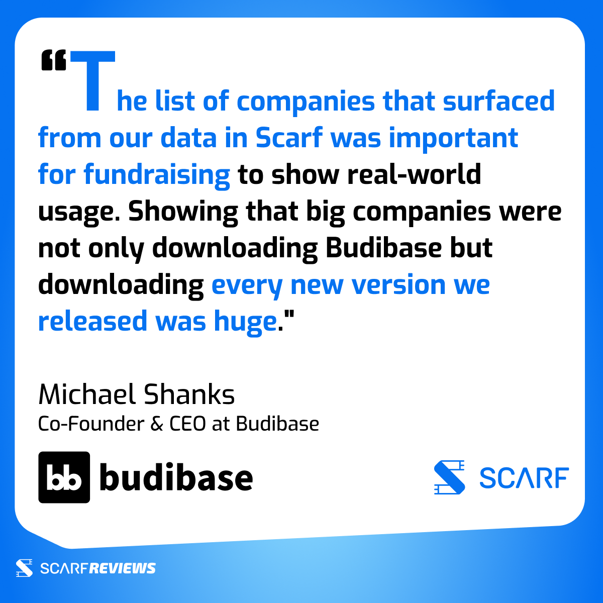 Did you know Scarf is not only used for lead generation or general download metrics? Scarf has also been instrumental in companies being able to secure additional funding. Budibase CEO shared with us: