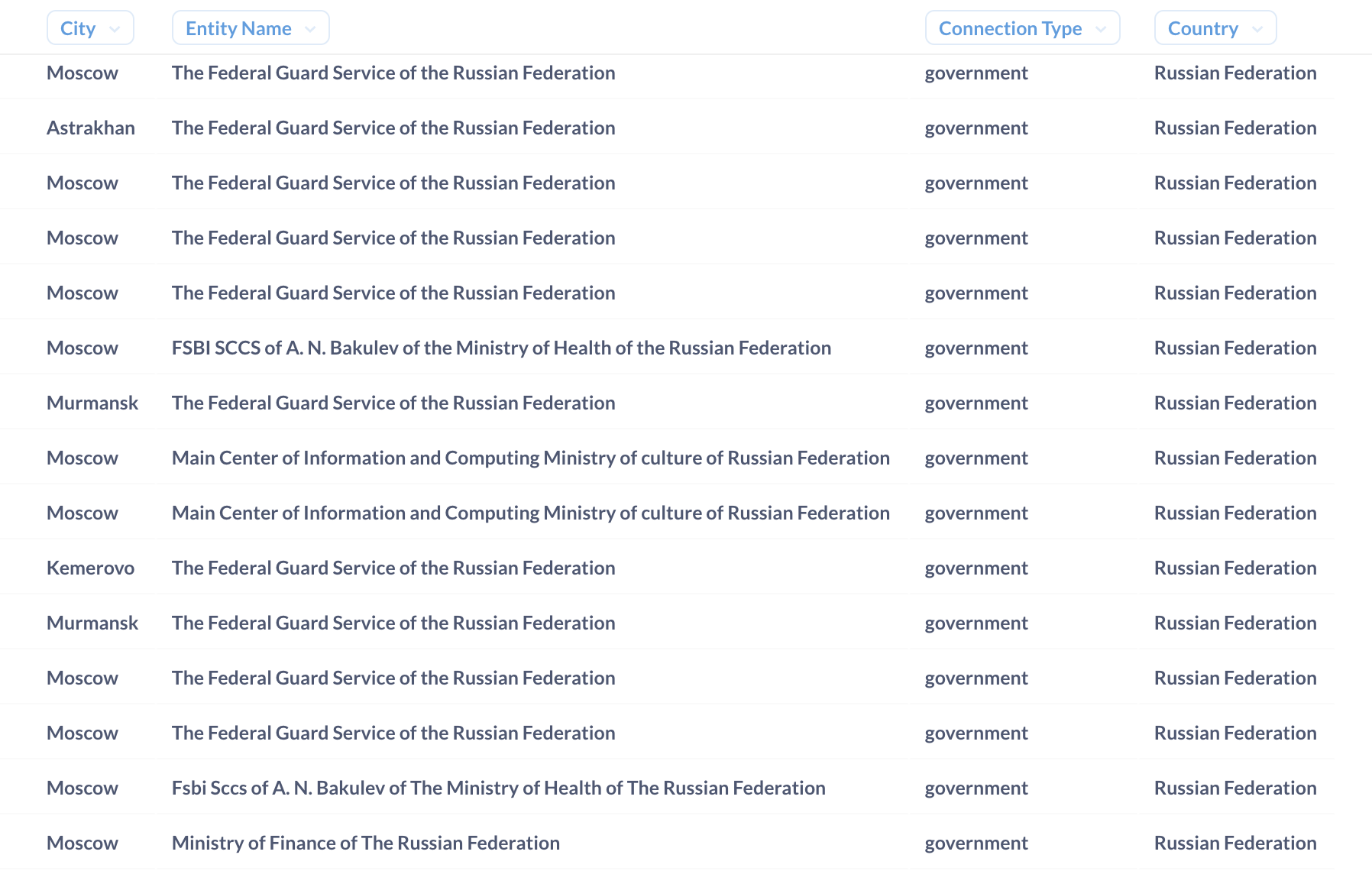 My analysis showed that Scarf has fulfilled ongoing software download requests from at least 17 distinct sources that have been confirmed to originate from the Russian Government. This activity primarily comprises their downloading of containerized applications via Scarf Gateway, including internal communications & chat, IT service orchestration, and more. The traffic spans multiple government departments, including The Federal Guard Service, The Ministry of Finance, The Main Center of Information and Computing, Ministry of Culture, and others.