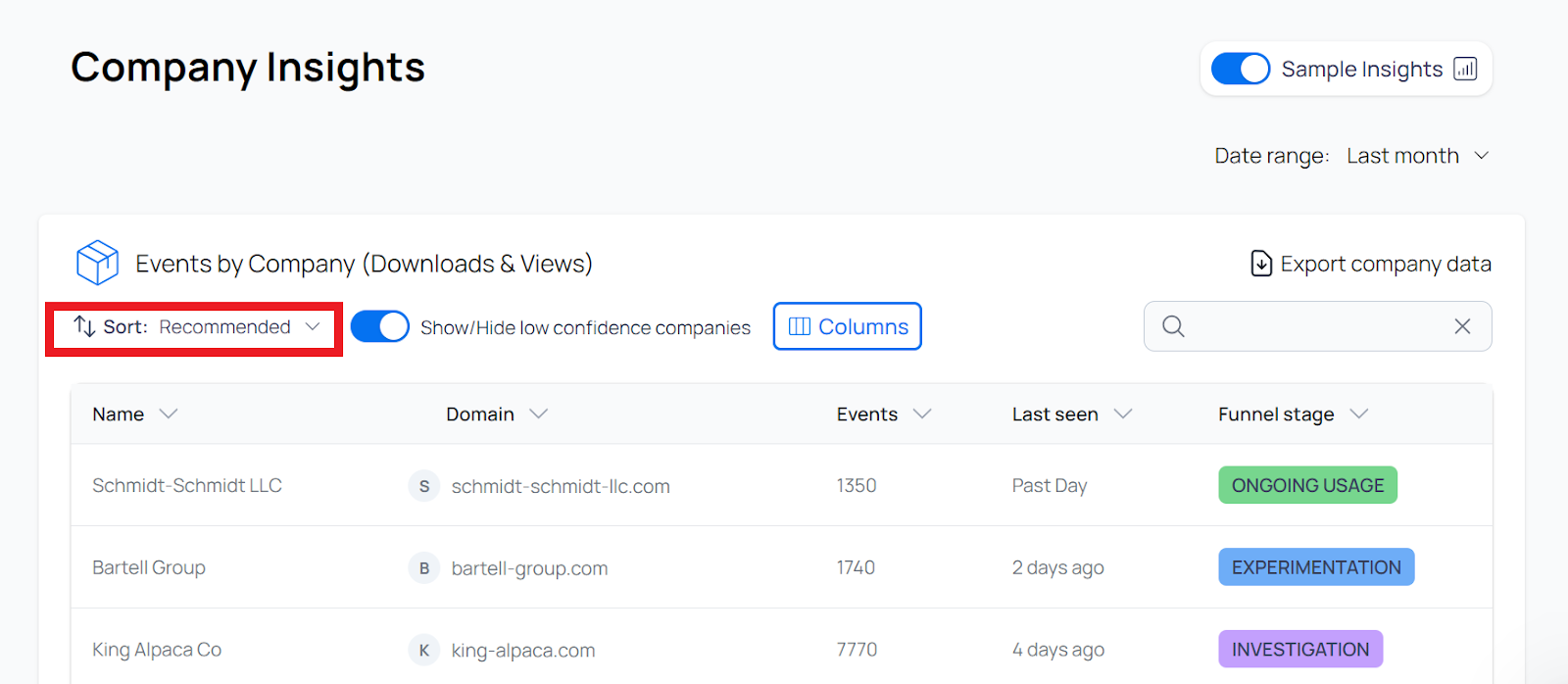 The Recommended Sort reorders the list of companies in the activity table in descending order, first by their point value, then by number of events, and finally by most recent to oldest action.