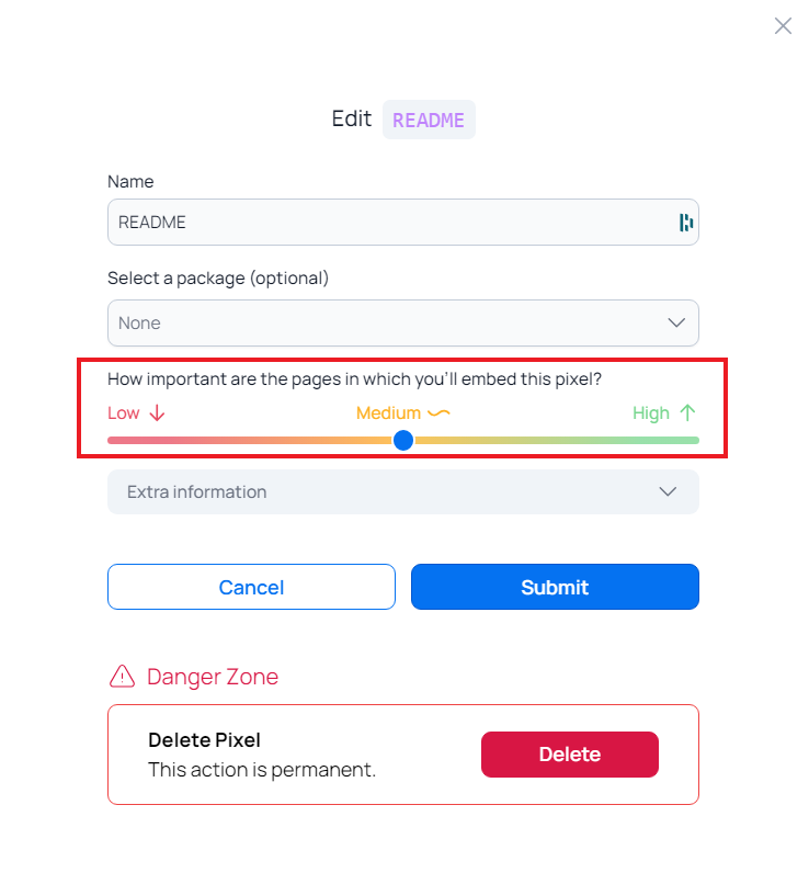 Event Importance allows you to determine the weight that certain events carry over others. For instance, a download should carry more weight than a page view on your public website, as it shows higher interest. This importance can be defined when setting up a new pixel or package and can be edited at any time. The importance will default to medium.