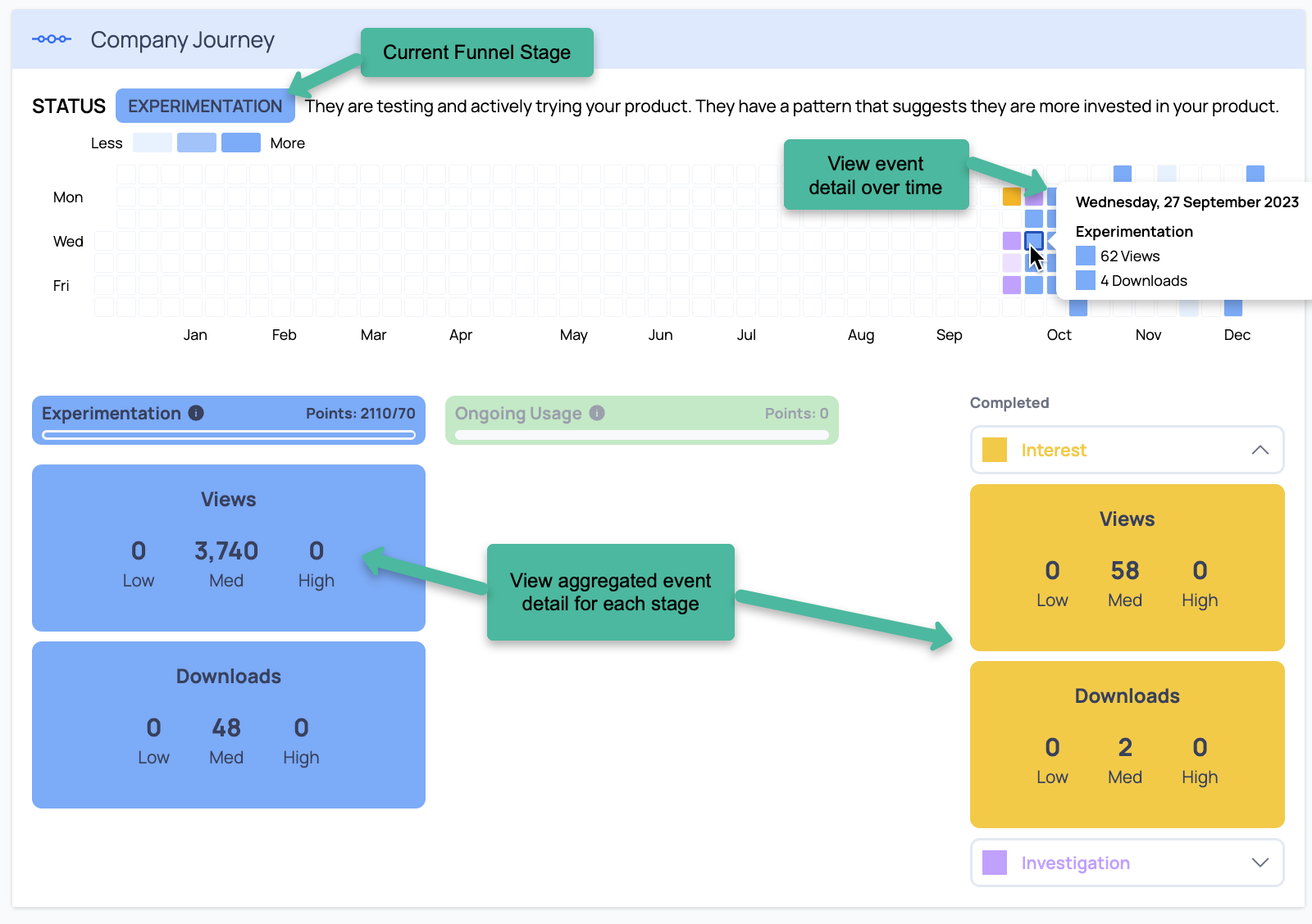 The company’s current funnel stage will be displayed in the top left, next to STATUS. Hover over the graphical calendar in the Company Journey to see details of the views and downloads that occurred over time. Below the graphical calendar are aggregated views of the total activity within each stage, including the current stage.
