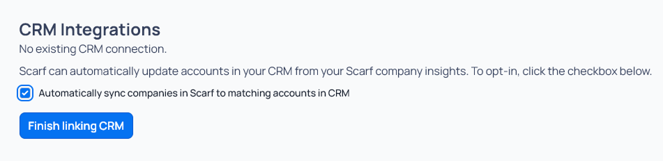 If you prefer to keep things manual and don’t want Scarf to read or write data automatically, we still highly recommend enabling “Automatically create new accounts.” It ensures that every new company engaging with your project is captured in your CRM.
