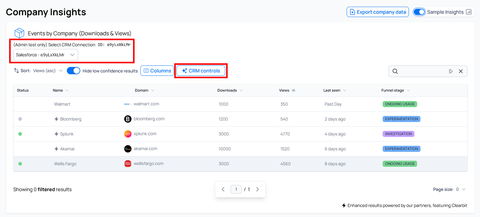 From the Scarf App home screen, go to Insights. Select your desired CRM from the dropdown. We’ll select our previously configured Salesforce instance.