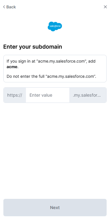 Enter your Salesforce subdomain. You’ll find your Salesforce subdomain by going to your Salesforce Settings, and navigating to “My Domain”.