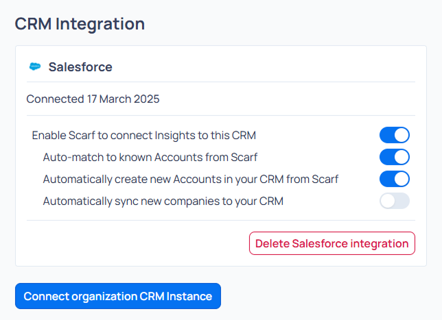 - Enable Scarf to connect Insights to this CRM: This toggle controls whether Scarf is actively syncing with your CRM. Turning it off temporarily disables the integration, stopping all reading and writing until switched back on.