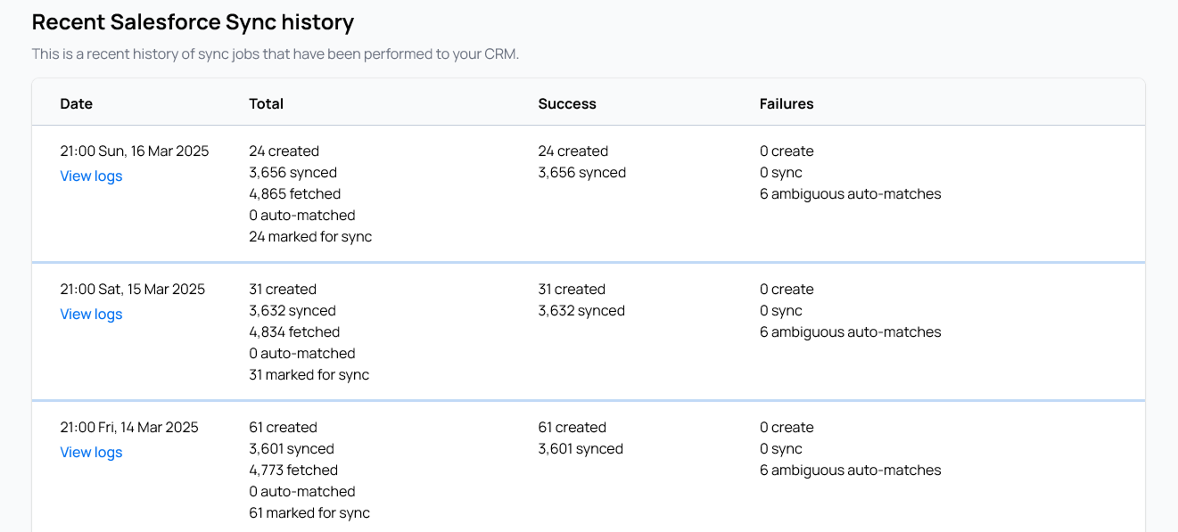 Scarf keeps a record of all actions performed during each sync in the Recent CRM Sync History table. This allows you to review what was created, synced, fetched, and matched during the latest sync cycles.