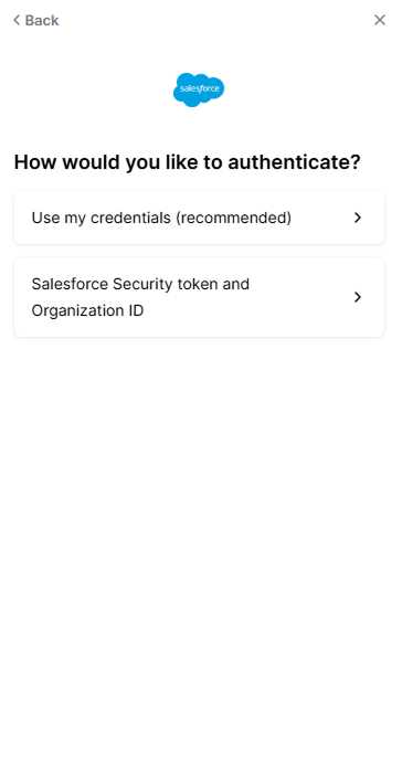 Note: If you’re authenticating with a Security Token and Organization ID, you’ll need your Salesforce username and password. The Security Token and your Salesforce Organization ID can be retrieved from your Salesforce settings.