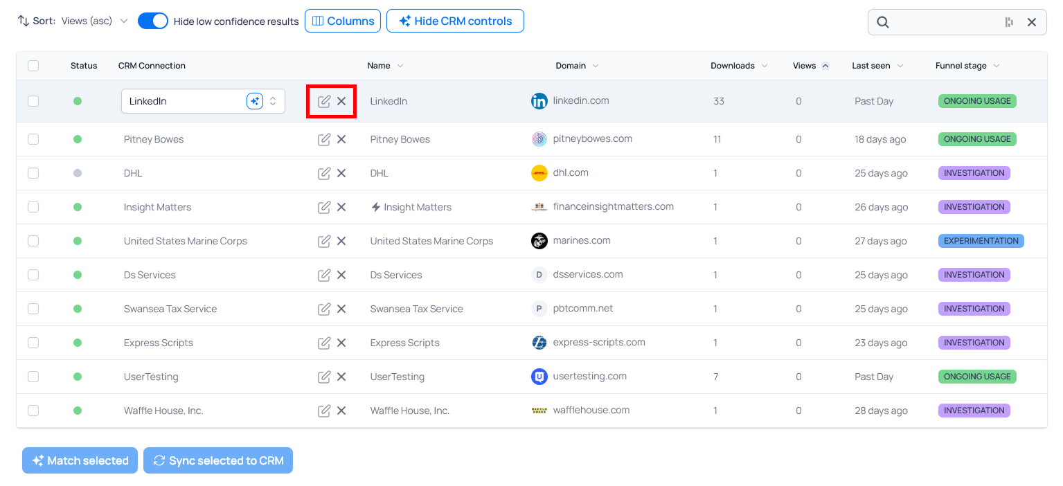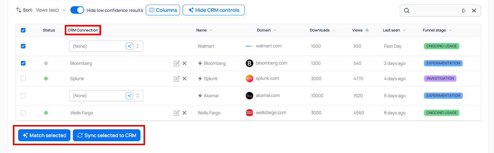 Next to each company name, you’ll find checkboxes that allow you to select multiple companies for bulk actions, like matching or syncing all the selected companies to your CRM.
