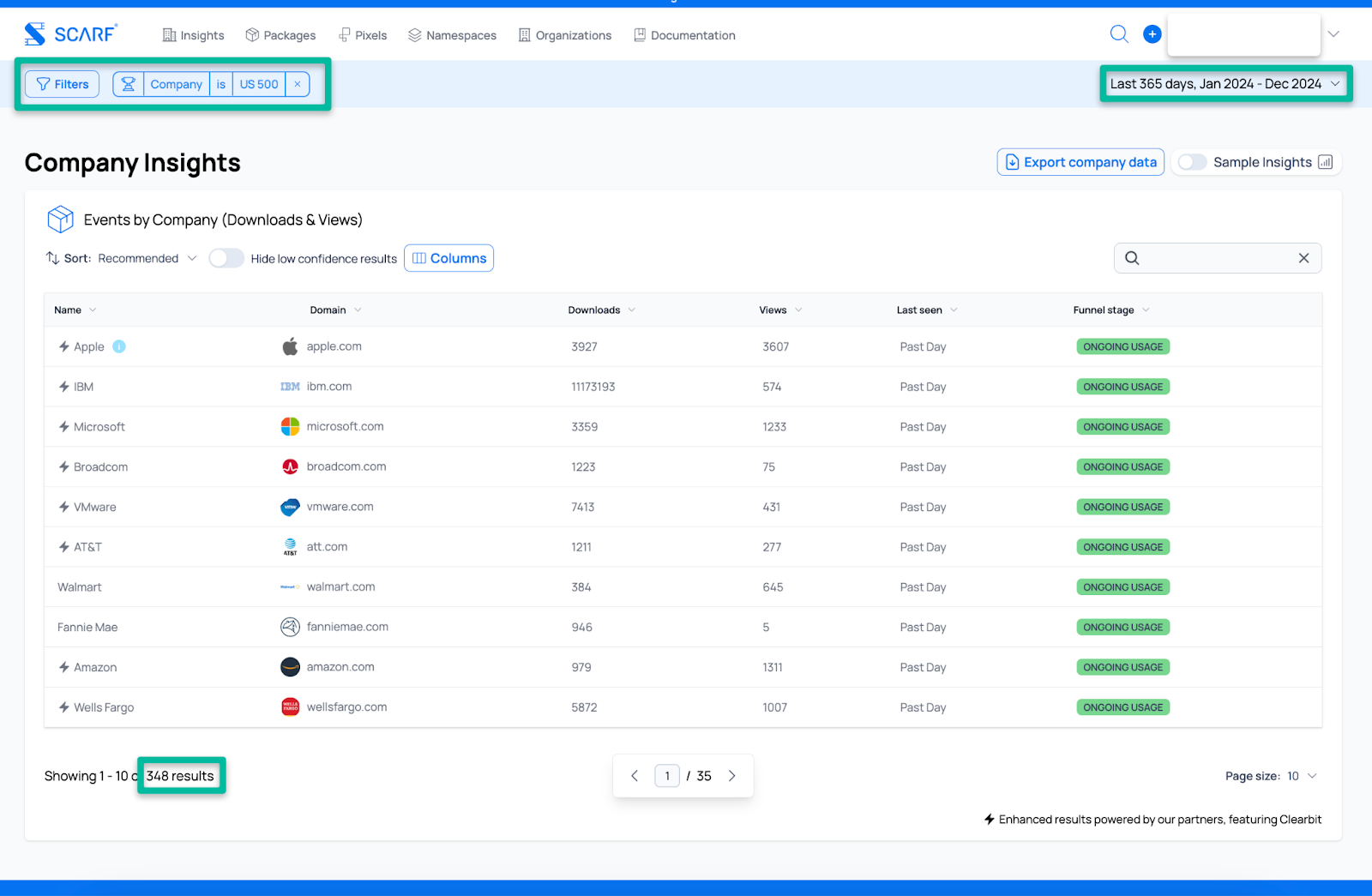 Paid customers can also check how many US500 companies interacted with your project in 2024. Using the same custom date range, select the US500 filter to see the total.