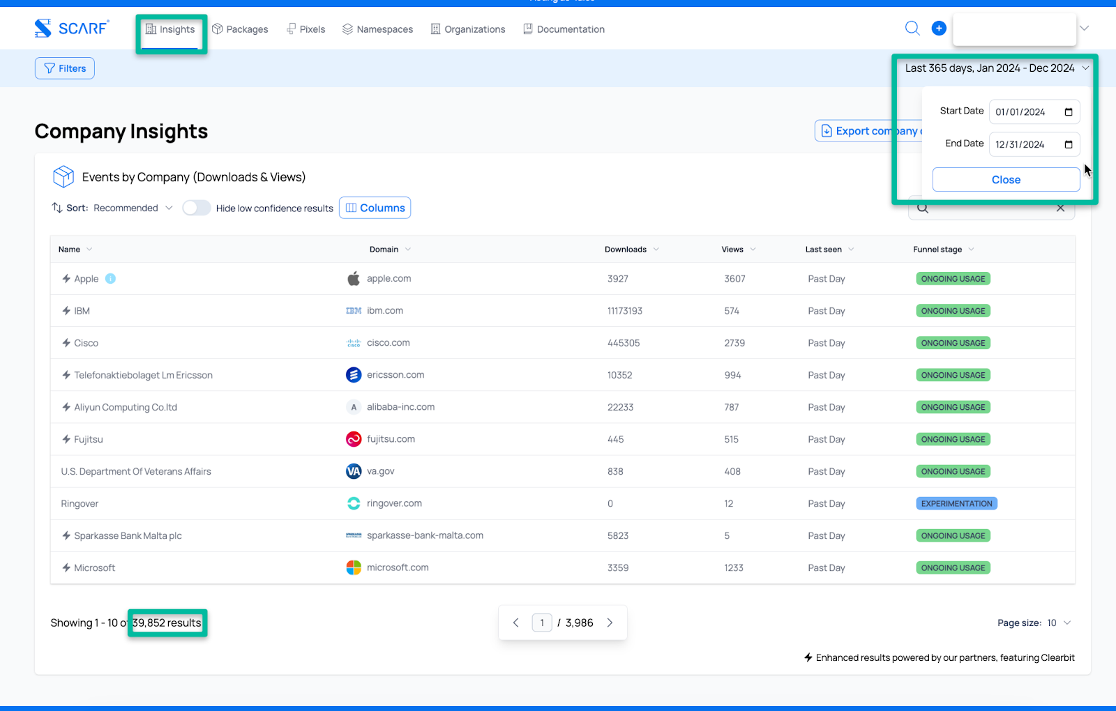 Here is an easy one to verify. Log into your Scarf account and go to the Organization you want to dig into, if you belong to more than one. Select “Insights” in the top navigation bar. Use a custom date range of 01/01/2024 - 12/31/2024, and you will see the total number of companies interacting with your project at the bottom of the page.