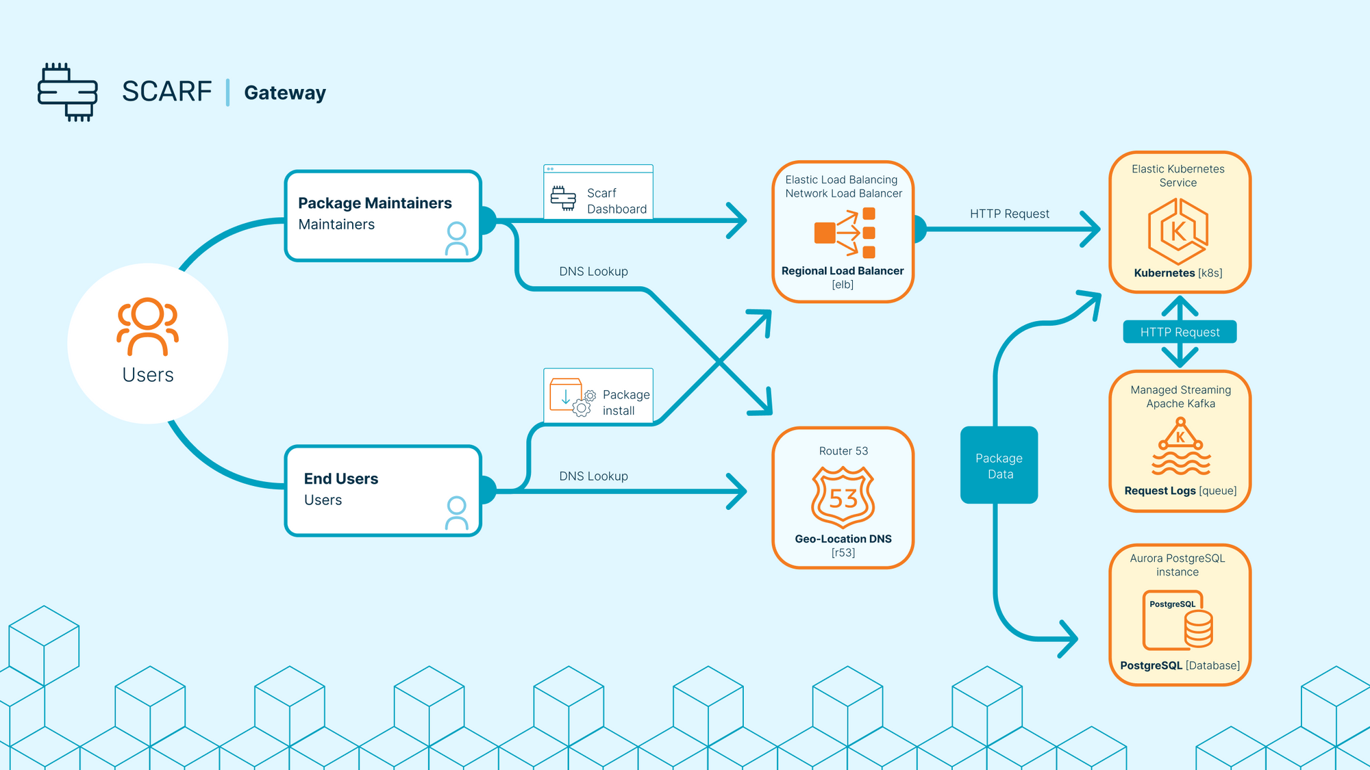 Scarf Gateway is the core of our end-user architecture. Deployed in multiple availability regions on Amazon’s global cloud, it tirelessly serves package content and logs HTTP requests.